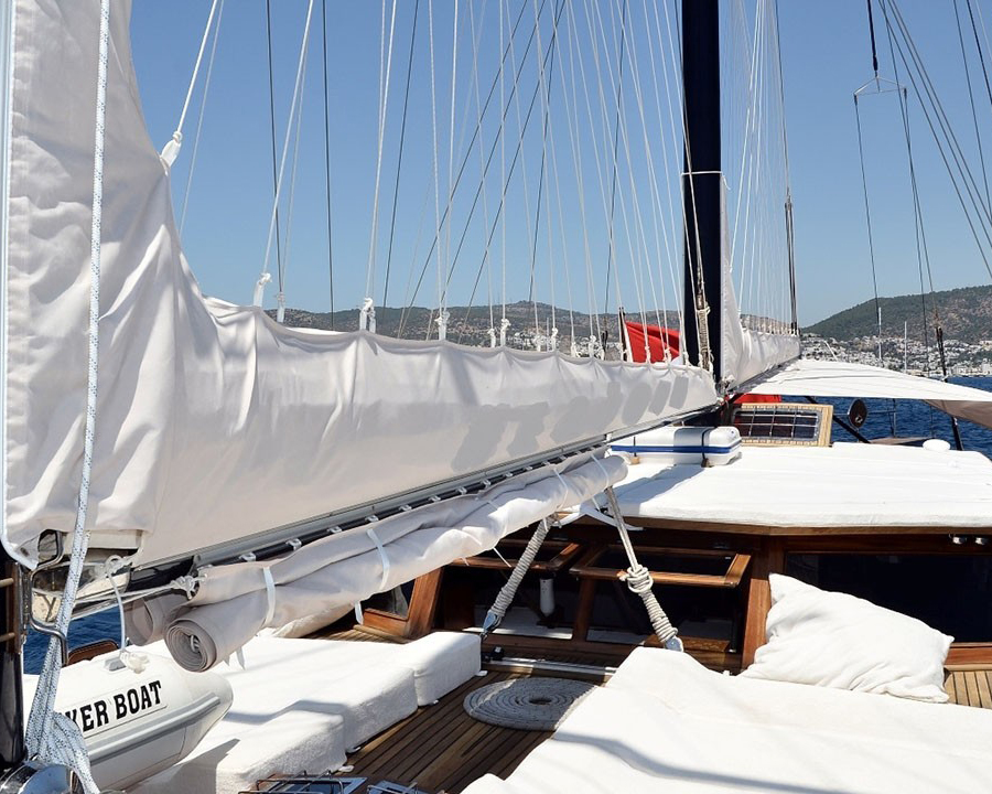 Teknenin dış alanları rahatlama ve eğlence için düşünceli tasarlanmış - hem ön hem kıçta geniş minderli oturma alanları, açık hava yemekleri için büyük dış mekan yemek masası ve rahat şilteler ile güverte sandalyeleri bulunan bol güneşlenme alanı mevcut. 255 metrekare yelken alanı bulunan geleneksel yelken takımı koşullar uygun olduğunda otantik yelken deneyimleri sunuyor.