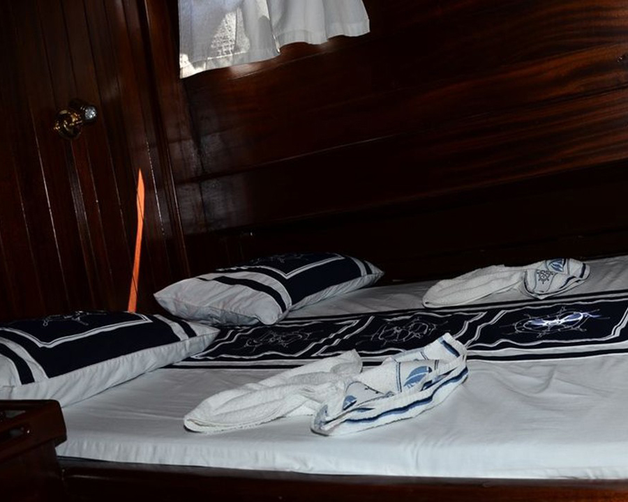 Bu modern tekne, her birinde duş ve WC bulunan özel banyo, bireysel klima kontrolü ve rahat mobilyalar olan dört iyi döşenmiş çift kişilik kabinde 8 misafir ağırlayabiliyor. Modern yapım sessiz çalışma, mükemmel yalıtım ve güvenilir sistemler sağlayarak bu boyut kategorisindeki eski teknelere kıyasla üstün konfor seviyesi sunuyor.