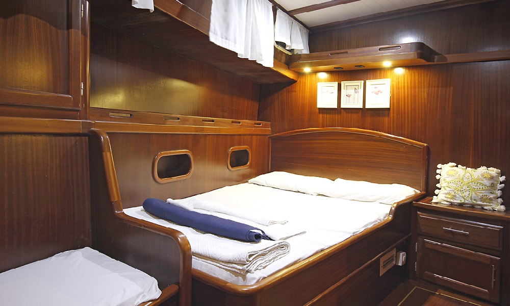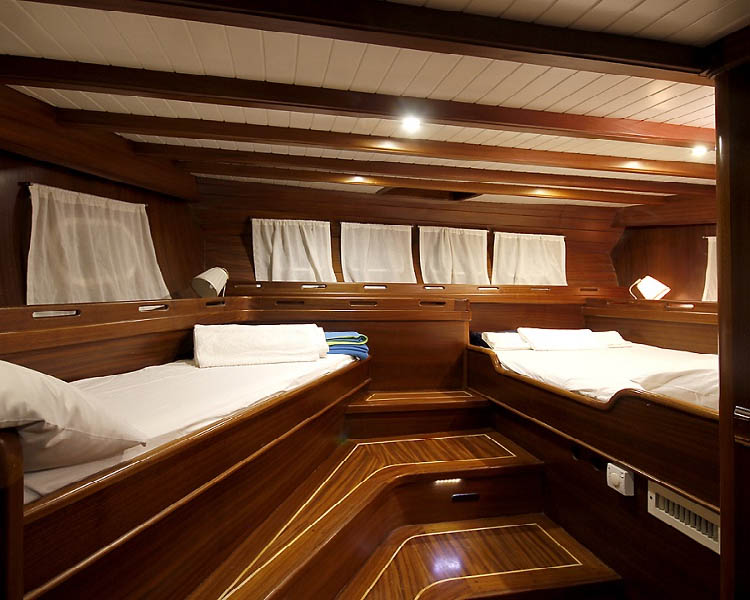 Şeker Ayşe, iki master kabin, bir çift kişilik kabin ve bir ikiz kabin olarak düzenlenmiş dört rahat kabinde 8 misafir ağırlayabiliyor. Her kabin bireysel klima, duş ve WC bulunan özel banyo ve teknenin karakterini yansıtan tasarım unsurları içeriyor. 2006'daki kapsamlı yenileme klasik guletleri bu kadar çekici kılan otantik cazibesi korurken modern konfor standartları sağlıyor.