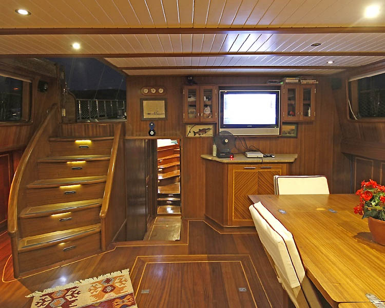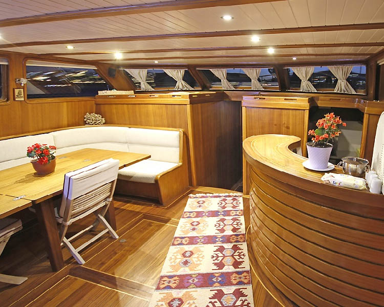 Klimalı salon teknenin kalbi görevi görüyor - rahat iç mekan yemek olanakları, rahatlama için ayrı oturma alanı ve TV, DVD oynatıcı ile müzik sistemi dahil eğlence sistemleri sunuyor. Bu misafirperver alan geleneksel tasarım unsurlarını modern olanaklar ile birleştirerek hava değişiklikleri veya akşam dinlencesi sırasında sosyalleşme, yemek ve eğlence için mükemmel ortam yaratıyor.