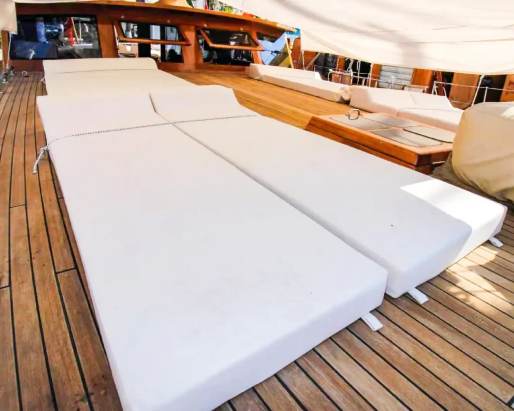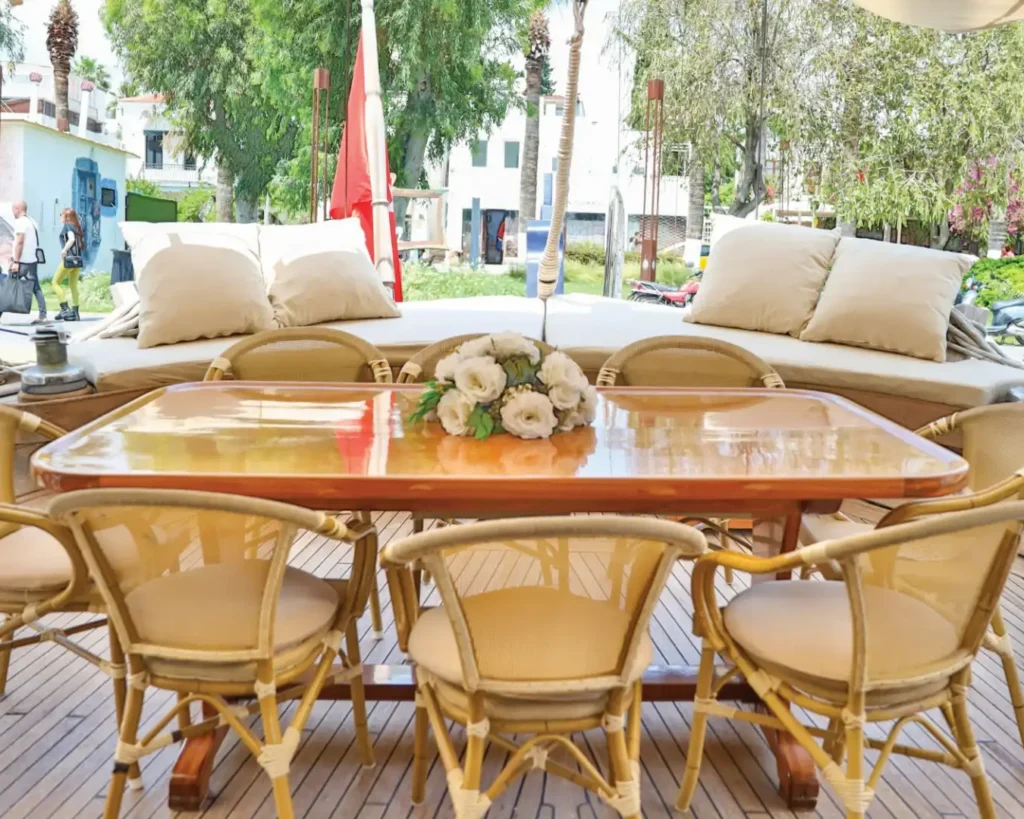 Geminin açık alanları da bir o kadar etkileyici. Farklı seviyeli güverteler, yemek yeme, güneşlenme ve su sporları için ayrı ayrı düzenlenmiş. Ana güvertenin arkasında gölgelik sistemli geniş yemek alanı varken, üst katta panoramik manzaralı özel dinlenme köşesi yer alıyor. Ön tarafta ise ek güneşlenme alanı ve su sporları malzemelerine kolay ulaşım sağlanıyor.