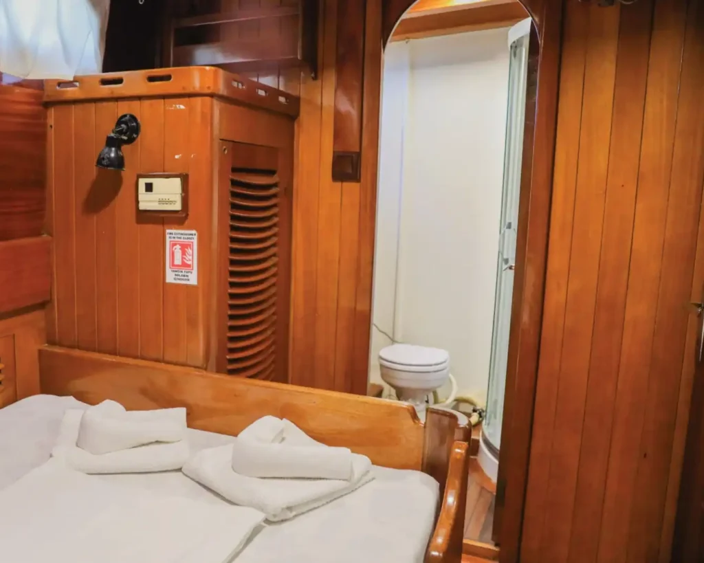 Bu zarif gemi, 8 misafir için tasarlanmış beş özel kabinde benzersiz bir konaklama deneyimi sunuyor. Büyük pencereler ve kişisel oturma köşeleri olan üç ana süit ile premium donanımlı iki VIP kabin, misafirlere evlerindeki konforu aratmayacak bir ortam hazırlıyor. Her odada tropik yağmur etkili duşlar, kişiye özel ayarlanabilen klima, akıllı televizyon sistemleri, kablosuz müzik bağlantısı ve en kaliteli yatak takımları bulunuyor.
